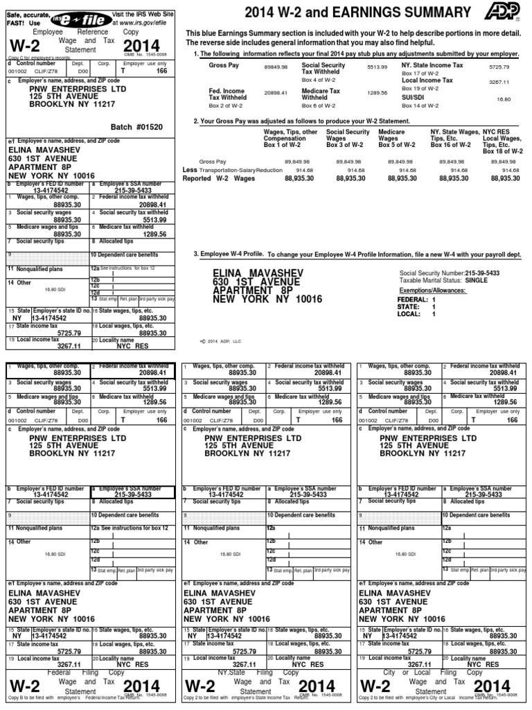 Elina Shinkar W2 2014 Irs Tax Forms Social Security United States